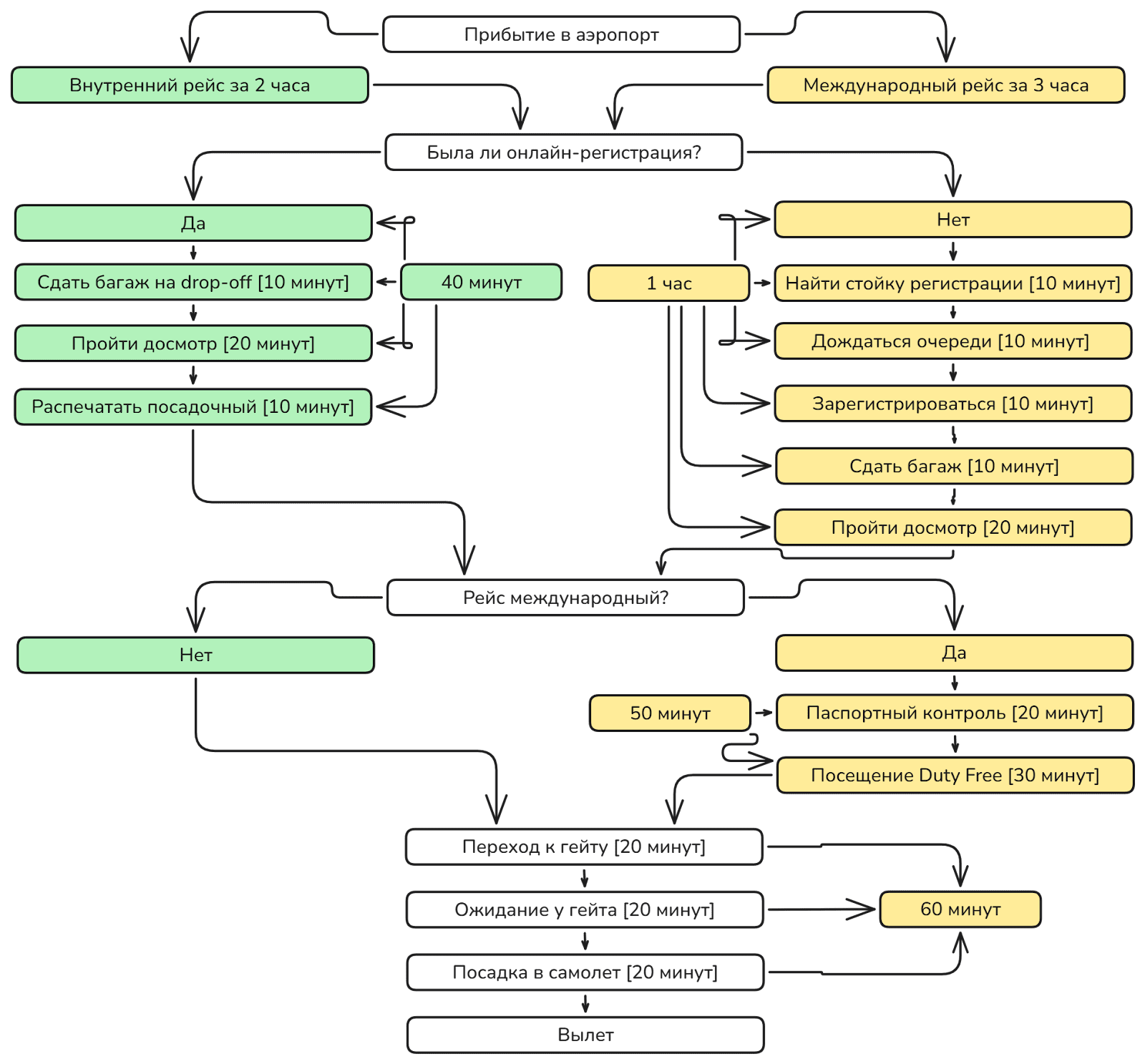 На внутренние рейсы приезжайте за 1,5-2 часа, на международные — за 3-4. Регистрация закрывается за 40 минут до отправления, посадка — за 15-25. Проверили на себе — работает всегда. Базовый алгоритм с указанием времени до вылета: